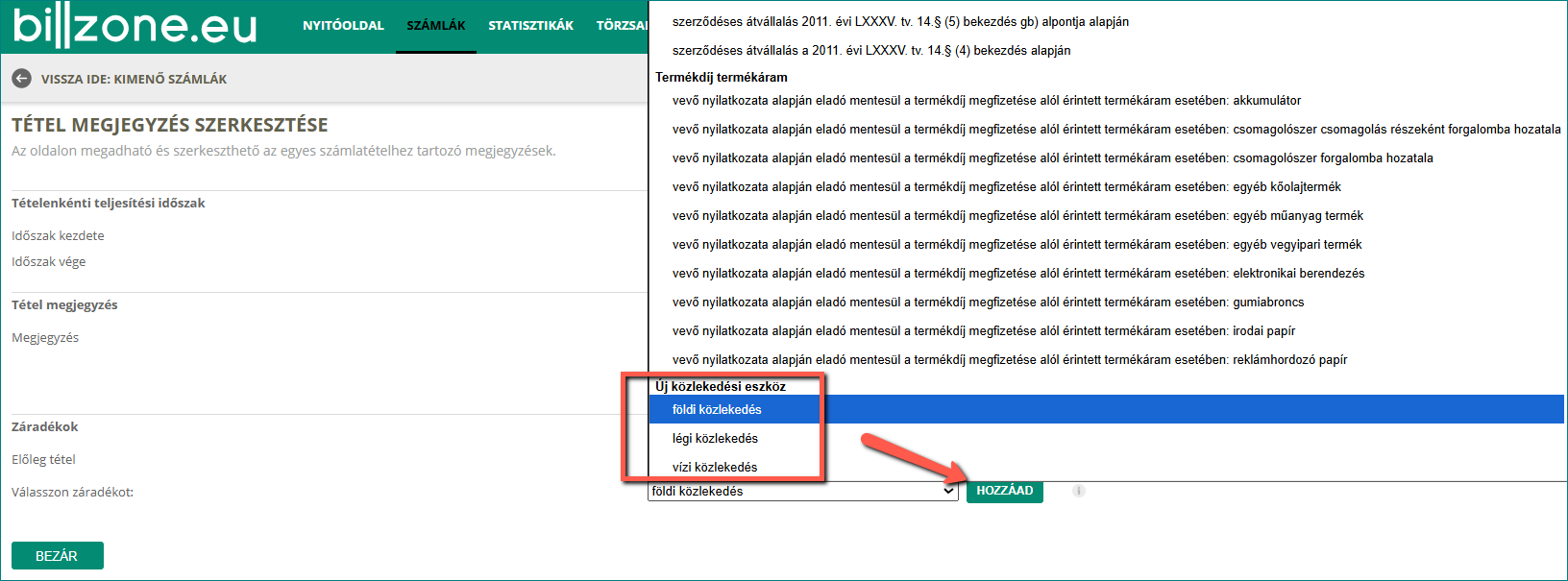 * új közlekedési eszköz (szárazföldi / vízi/ légi) tételzáradék töltése