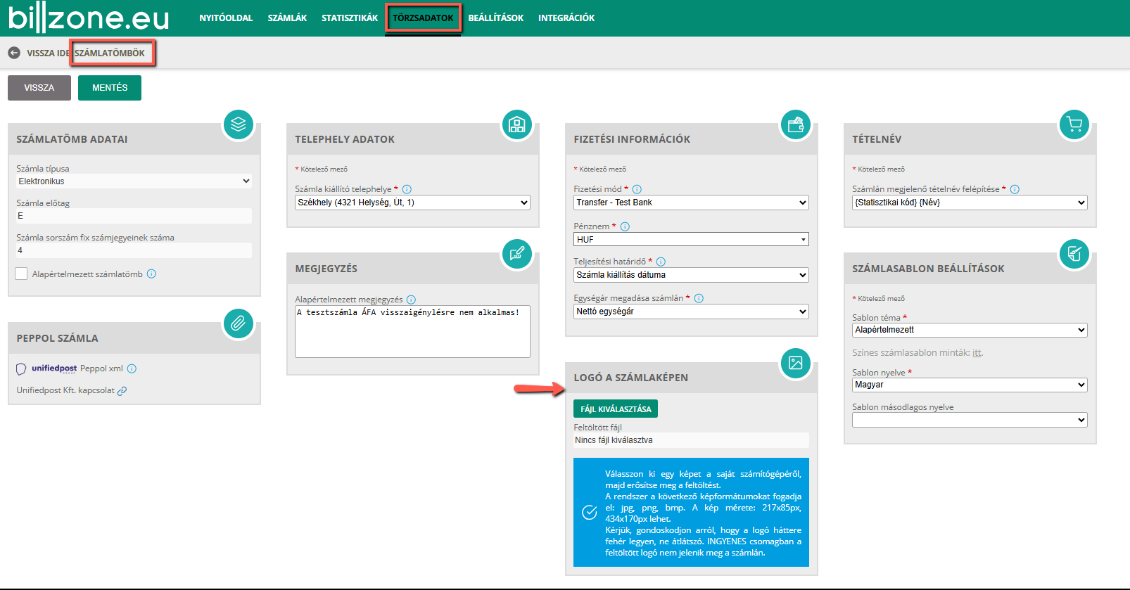 Alapértelmezetten a Céges fiók beállításokban feltöltött logó kerül megjelenítésre. Ha ettől eltérő logót szeretnénk megjeleníteni a számlaképen a Törzsadatok/Számlatömbök menüben található Logó a számlaképen dobozban tölthetjük azt fel.
